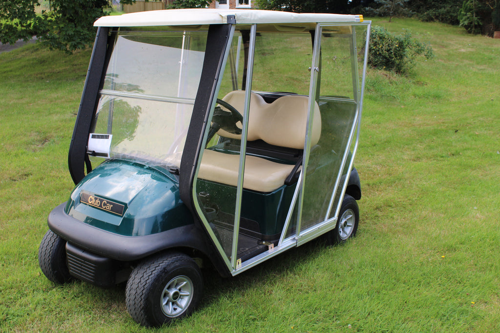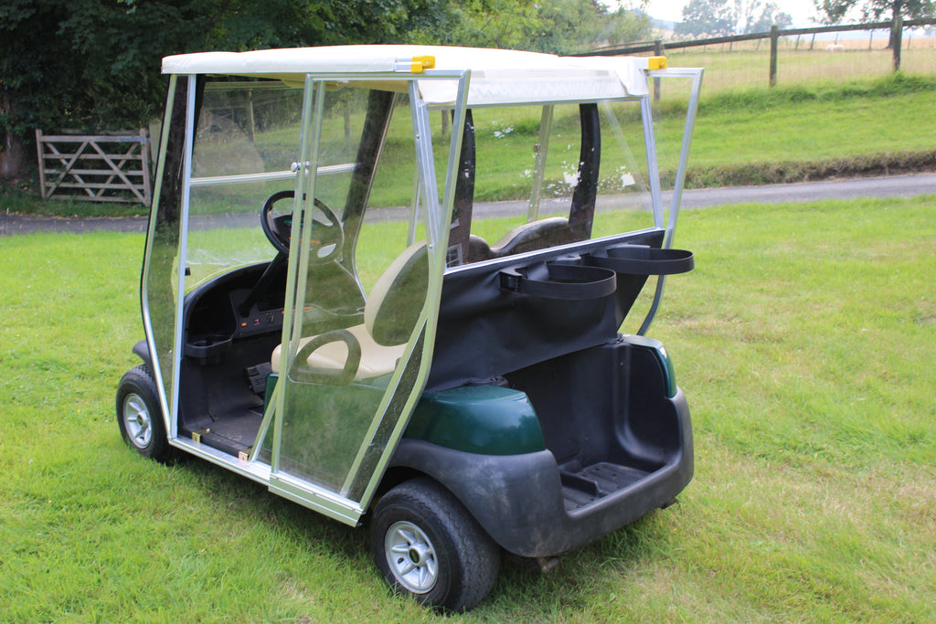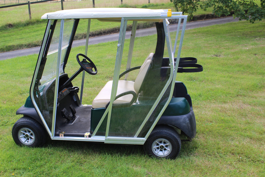 Made from aluminium and toughened perspex these are great value enclosures for all makes of golf carts, this is on a Club Car Precedent, when assembled the MEE Enclosure keeps the occupants, dry and away from the wind whilst being easy to get into and out of the golf cart.